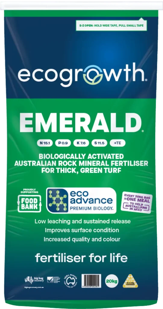 Ecogrowth Emerald is designed to enhance lawn surfaces by providing balanced nutrition and strong root growth. Colour is enriched in the leaf surface by increasing photosynthesis through trace balance and controlled macro release. Ecogrowth Emerald lawns are thicker and harder to wear due to enhanced tissue strength and stronger roots, resulting in a tighter knitted lawn and consistent surface in a wide range of conditions.